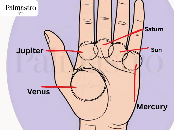 The mounts are the raised, padded areas under each finger and near your thumb. Lightly cup your hand to see which mounts stand out: